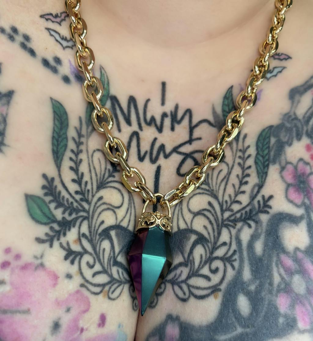 Each necklace comes with a complimentary sticker. - Ornate Topper - Statement Resin Crystal - Silver plated brass topper - 100% Metal Alloy Chain