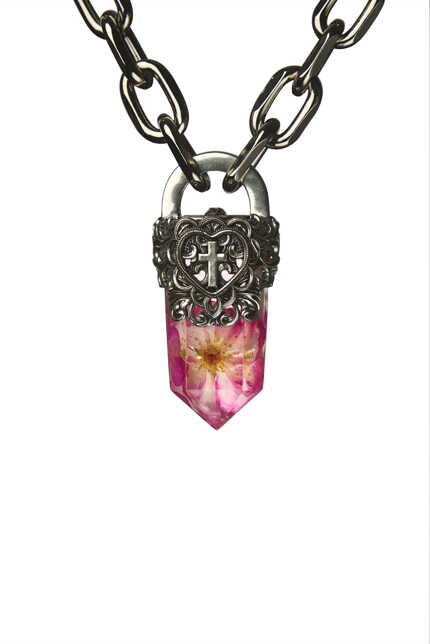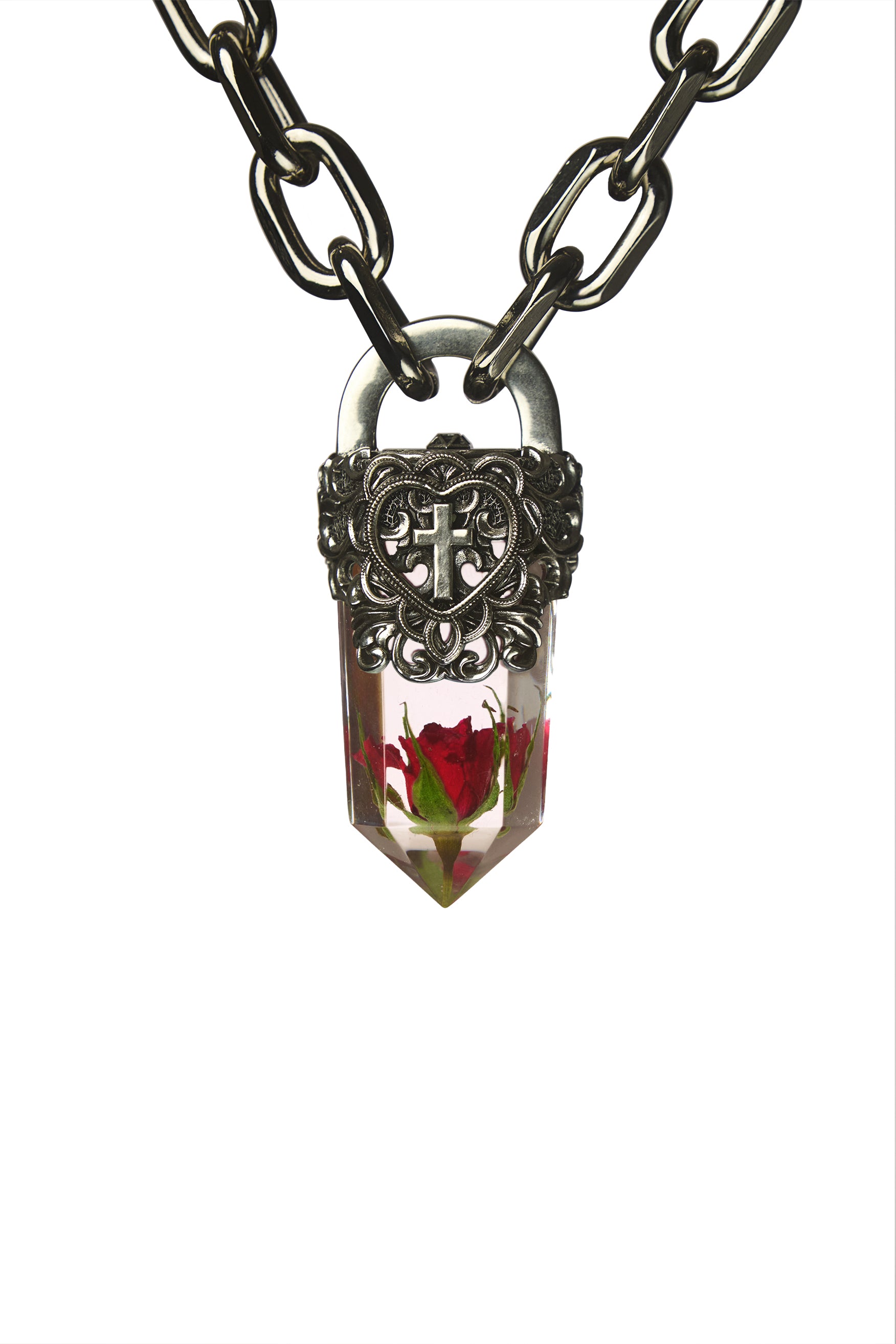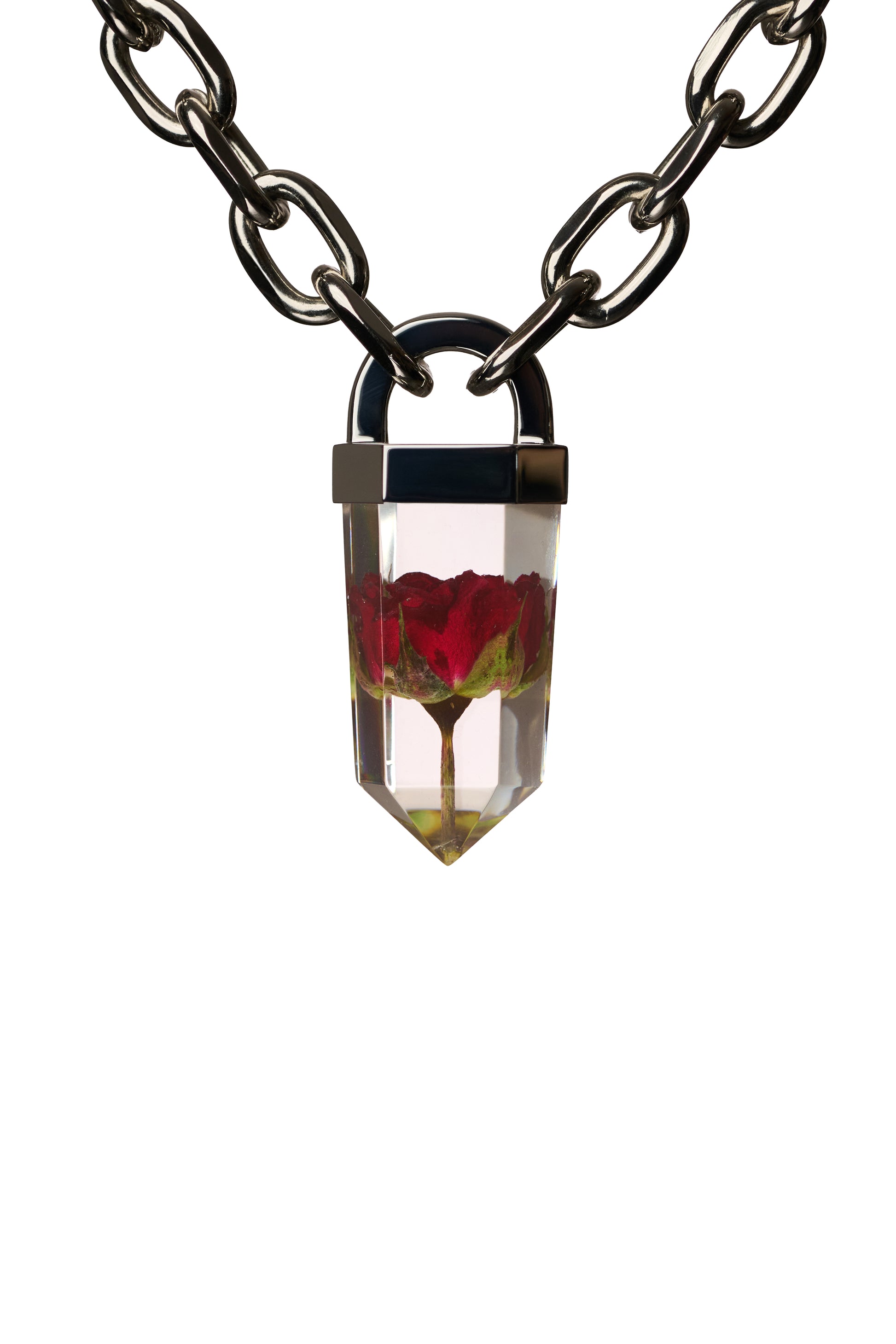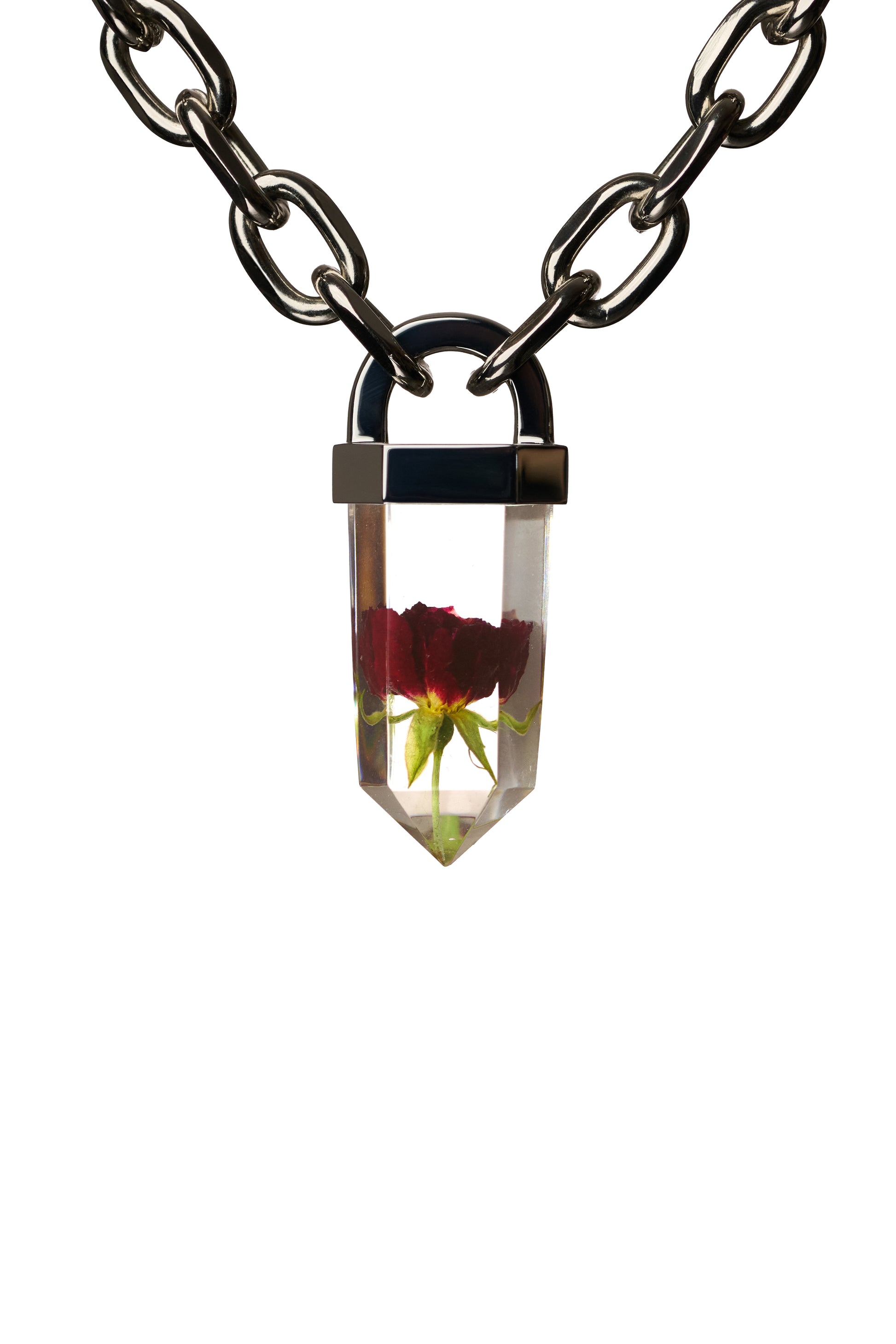 - Statement Resin Crystal - Silver Solder Topper - Small roses and other flowers available - Reinforced Design & Exceptional Quality - Pendant Size: - 100% Metal Alloy Chain