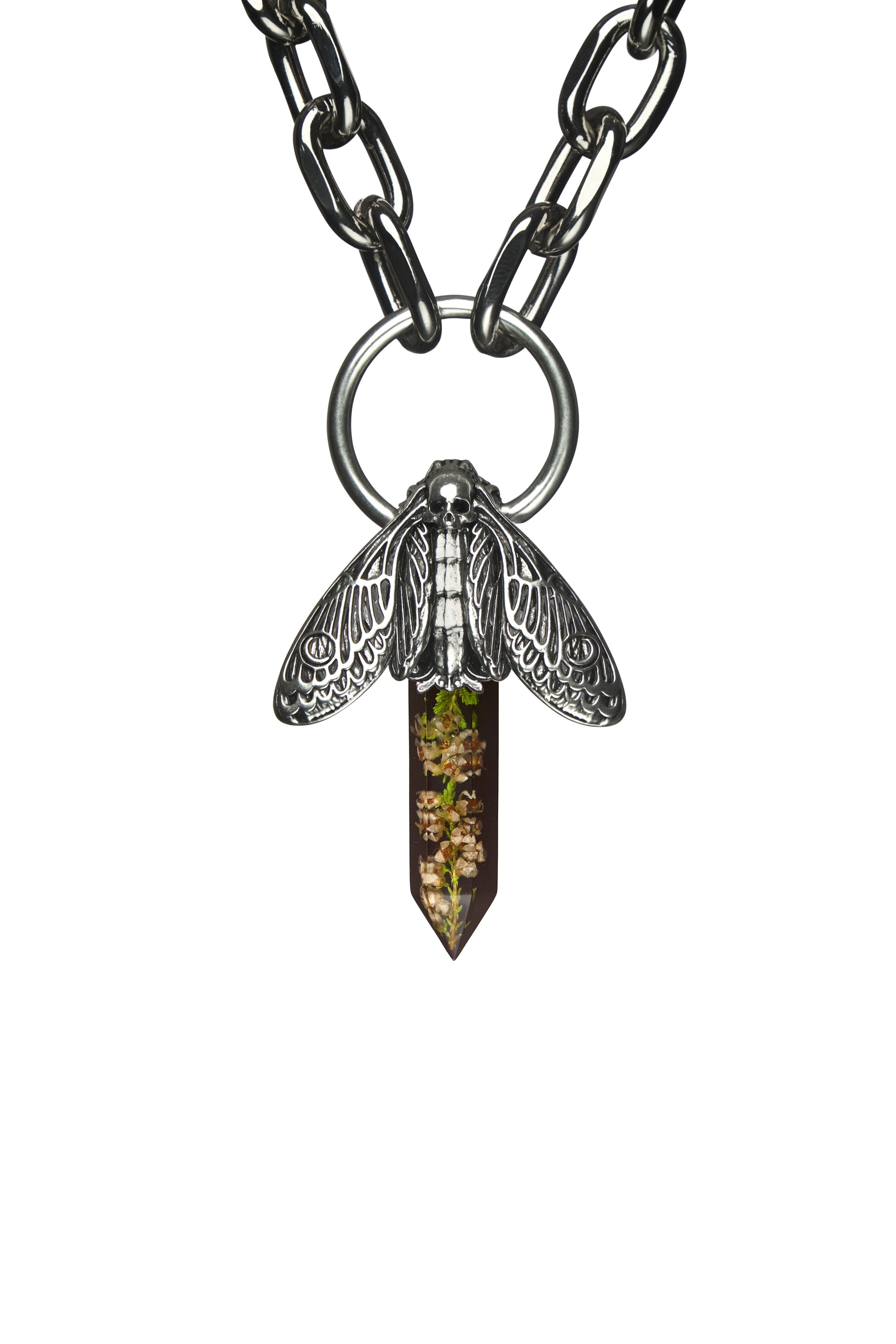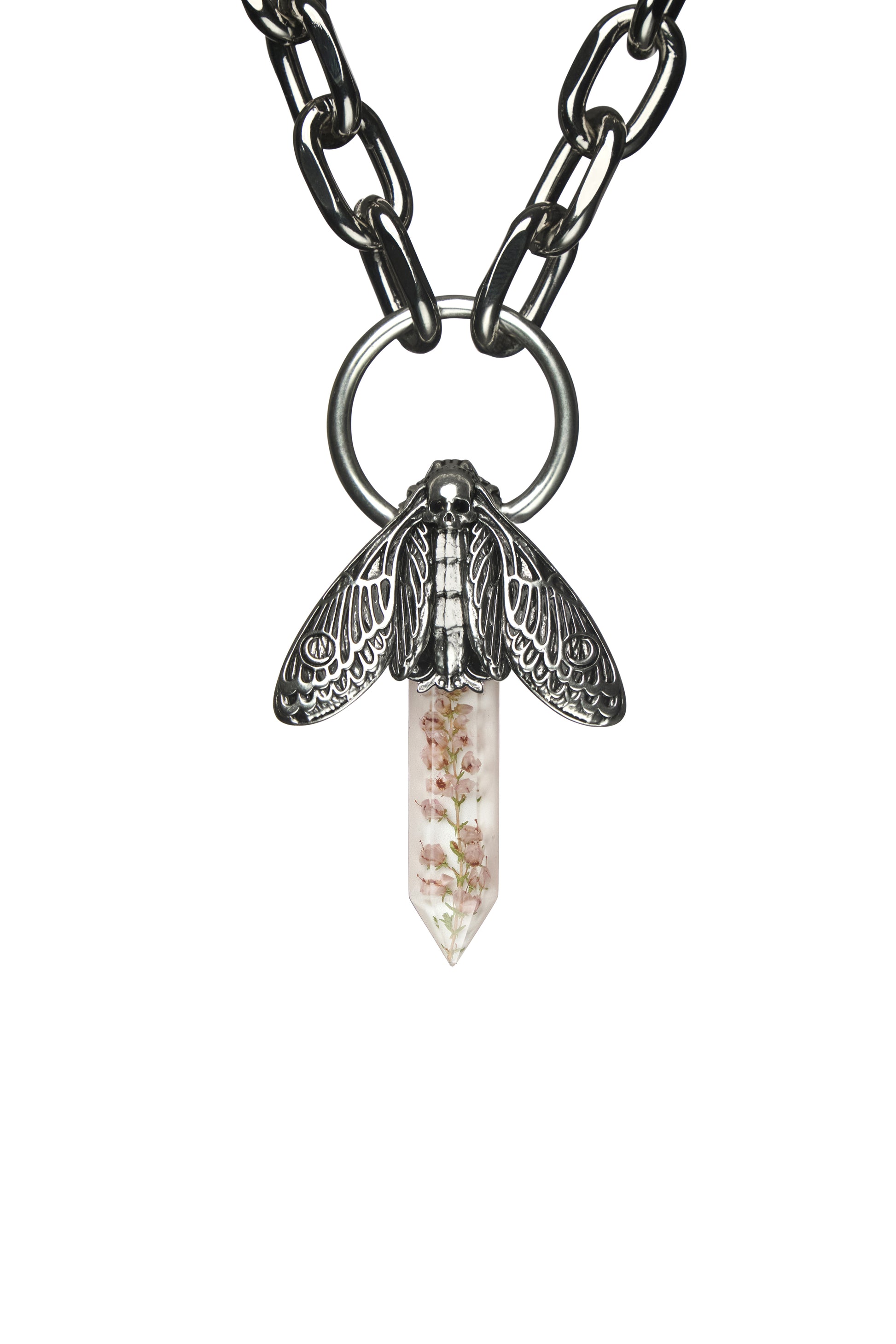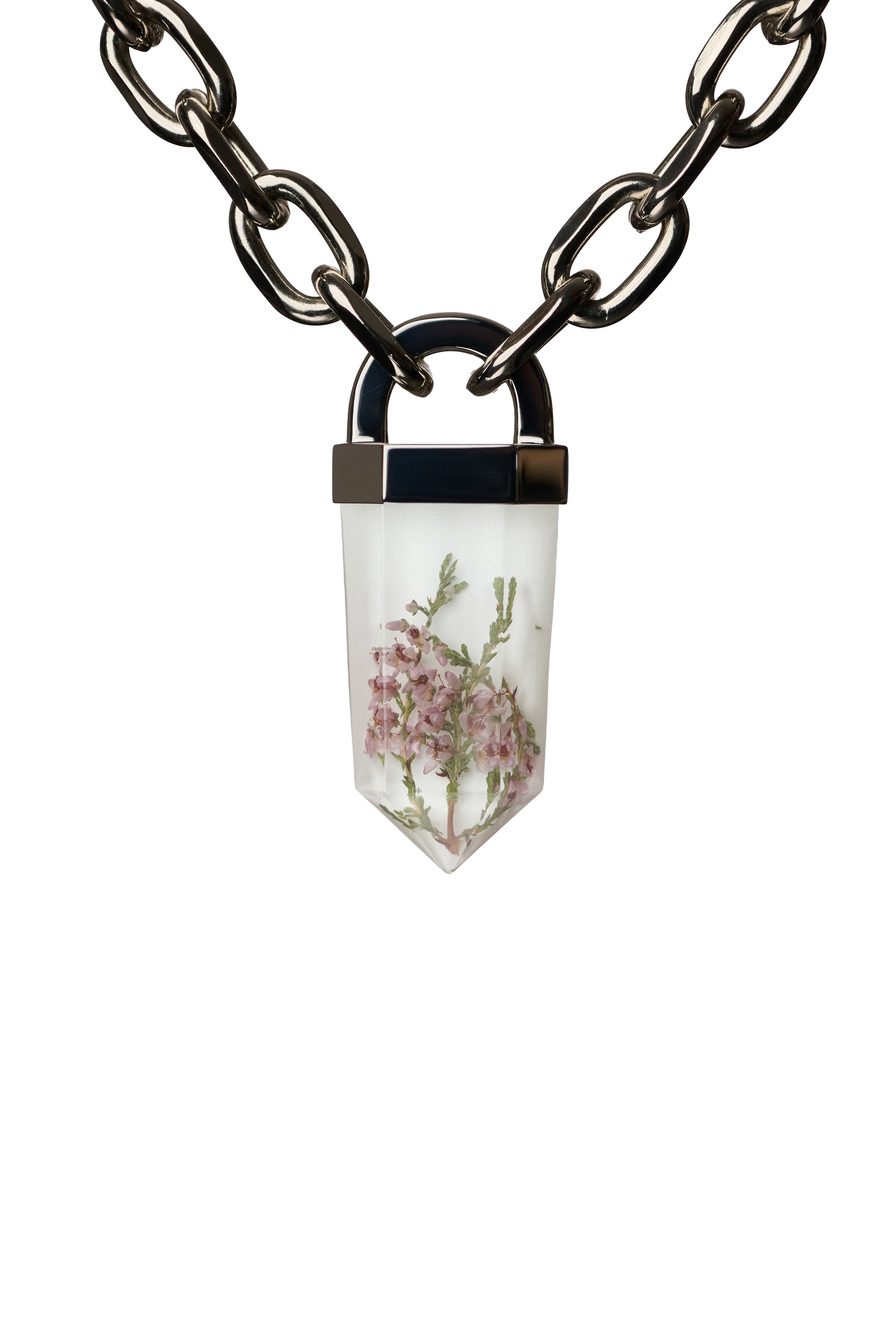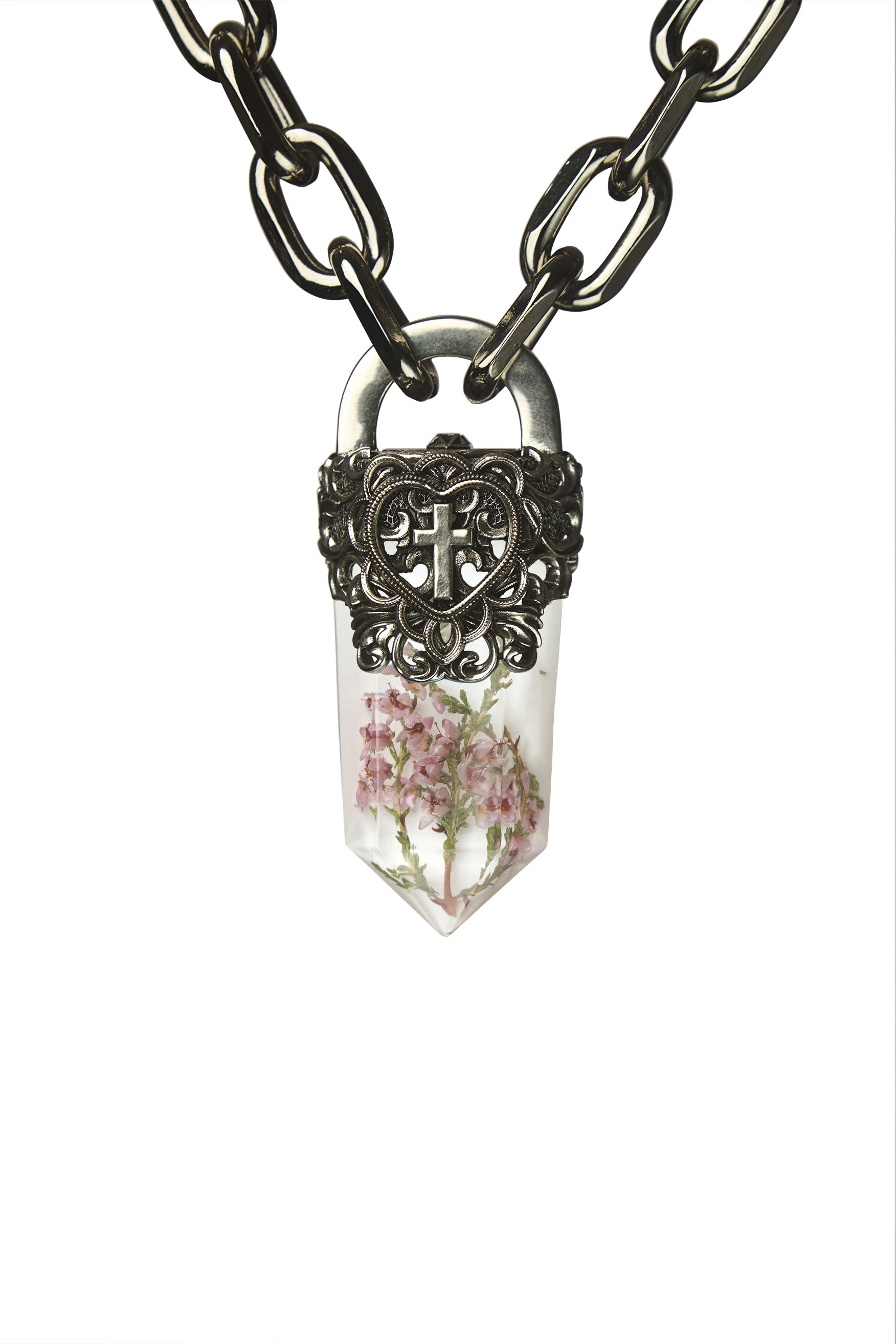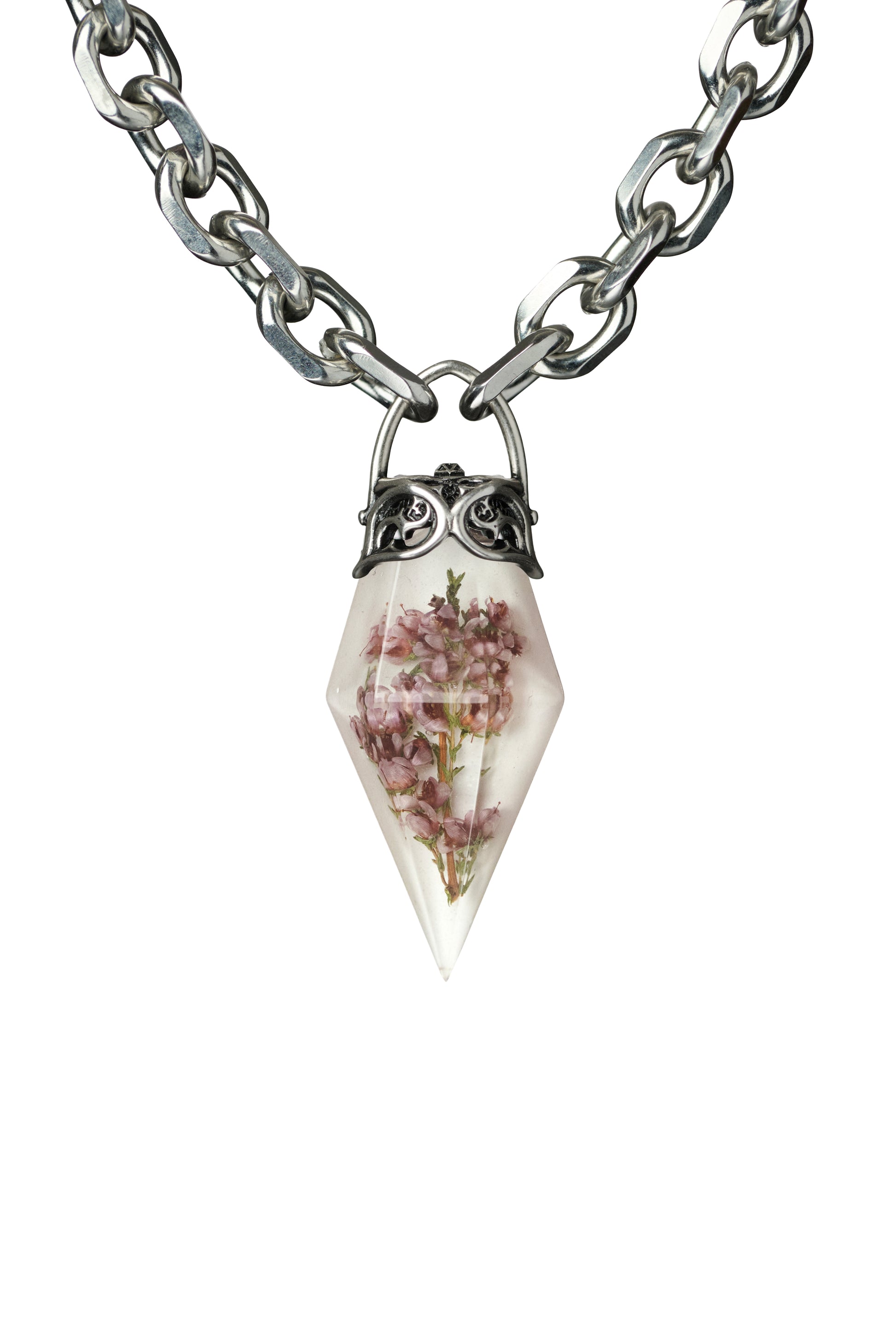 - Statement Resin Crystal - Silver Solder Topper - Small roses and other flowers available - Reinforced Design & Exceptional Quality - Pendant Size: - 100% Metal Alloy Chain